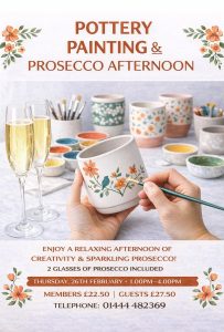 Sign up (max 18 people) to come and enjoy a relaxed afternoon of creativity and sparkling prosecco ( 2 glasses included in the price) and paint a piece of pottery. Members -£22.50 and Guests £27.50